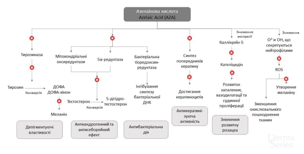 • Депігментуюча активність: азелаїнова кислота сприяє зменшенню пігментації шкіри за рахунок впливу на ферментні системи активованих меланоцитів. Вповільнює утворення меланосом. Селективно впливає на аномальні меланоцити. Інгібує тирозиназу. Пригнічує активність меланоцитів (інгібує НАДф-Д). За ефективністю депігментації не поступається 4% гідрохіноновому крему. Усуває постзапальну гіперпігментацію.
