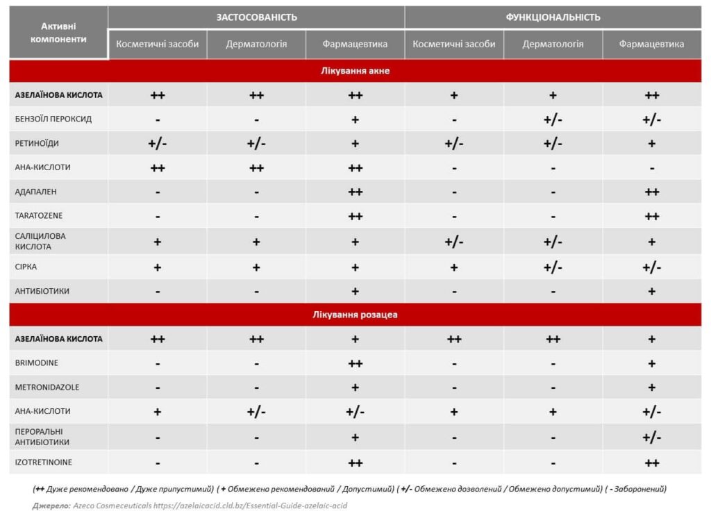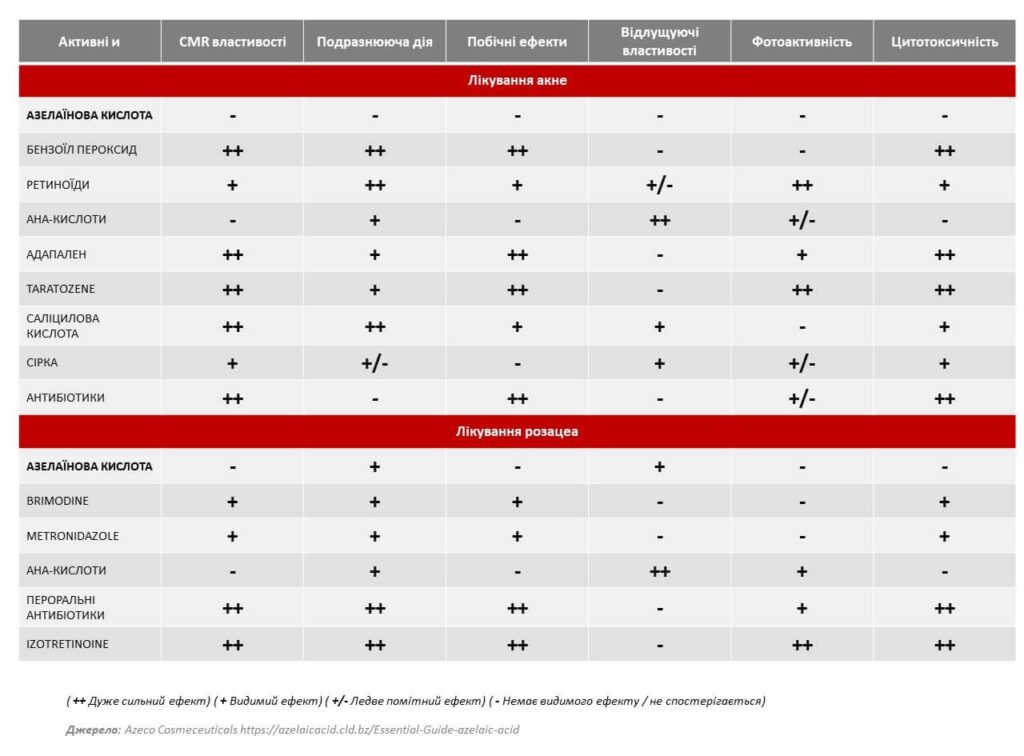 Таким чином, азелаїнова кислота має низку переваг порівняно з альтернативними інгредієнтами:
