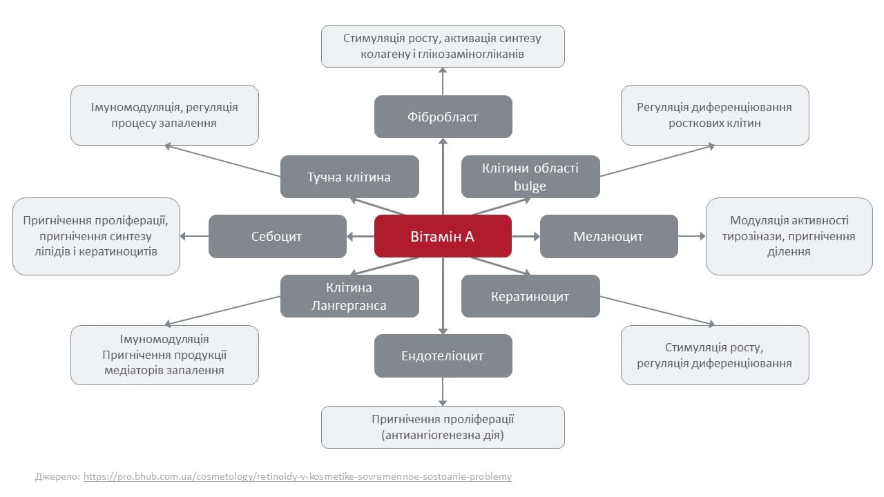 Ретинол стимулює активний поділ клітин базального шару епідермісу, прискорює регенерацію клітин. Крім того, впливає не тільки на кератиноцити, а й на більш глибокі дермальні структури — фібробласти, меланоцити, які відповідають за еластичність шкіри та рівномірність пігментації. Підсилює вироблення власного колагену, еластину, ліпідів та гіалуронової кислоти.