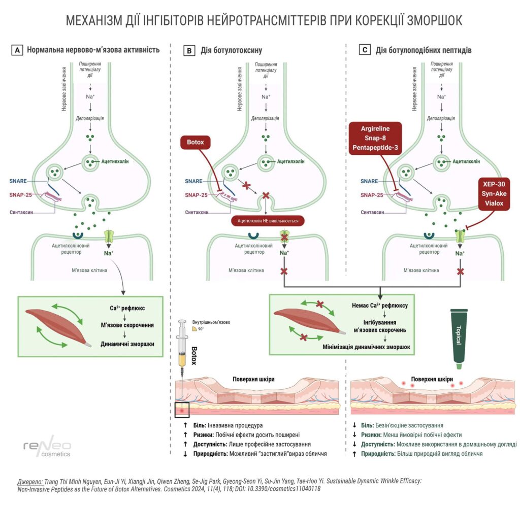 - Механізм дії: Аргірелін конкурентно зв’язується з активними ділянками білка SNAP-25, порушуючи його конформаційну взаємодію з Synaptobrevin і Syntaxin. Оскільки SNARE-комплекс необхідний для злиття синаптичних везикул із мембраною, цей механізм знижує вивільнення ацетилхоліну в синаптичну щілину. У результаті тимчасово зменшується передача нервового сигналу, ослаблюються м’язові скорочення, що сприяє розгладженню зморшок.