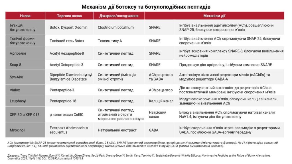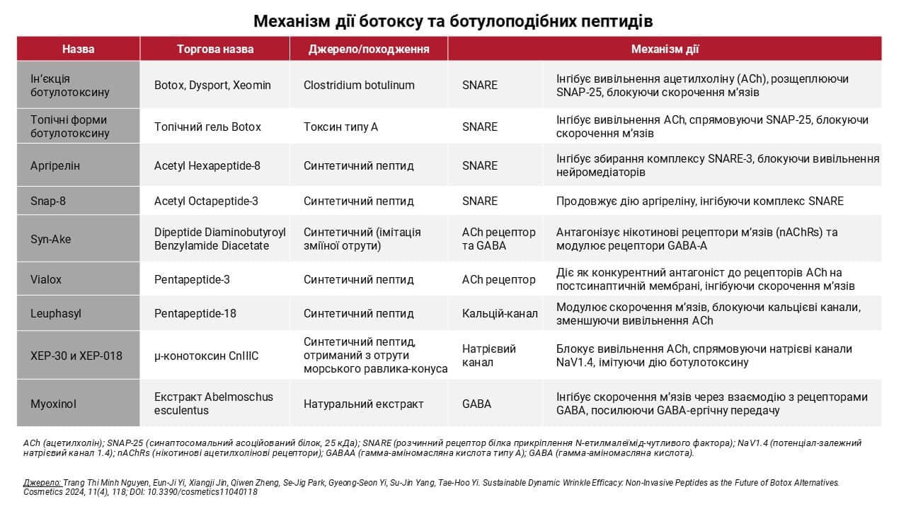 Сьогодні існує широкий спектр ботулоподібних пептидів як синтетичного, так і природного походження. Найефективнішими з них вважаються Аргірелін (Acetyl Hexapeptide-8) та Syn-Ake (Dipeptide Diaminobutyroyl Benzylamide Diacetate), які здатні скоротити зморшки до 52% протягом чотирьох тижнів без ін’єкцій.