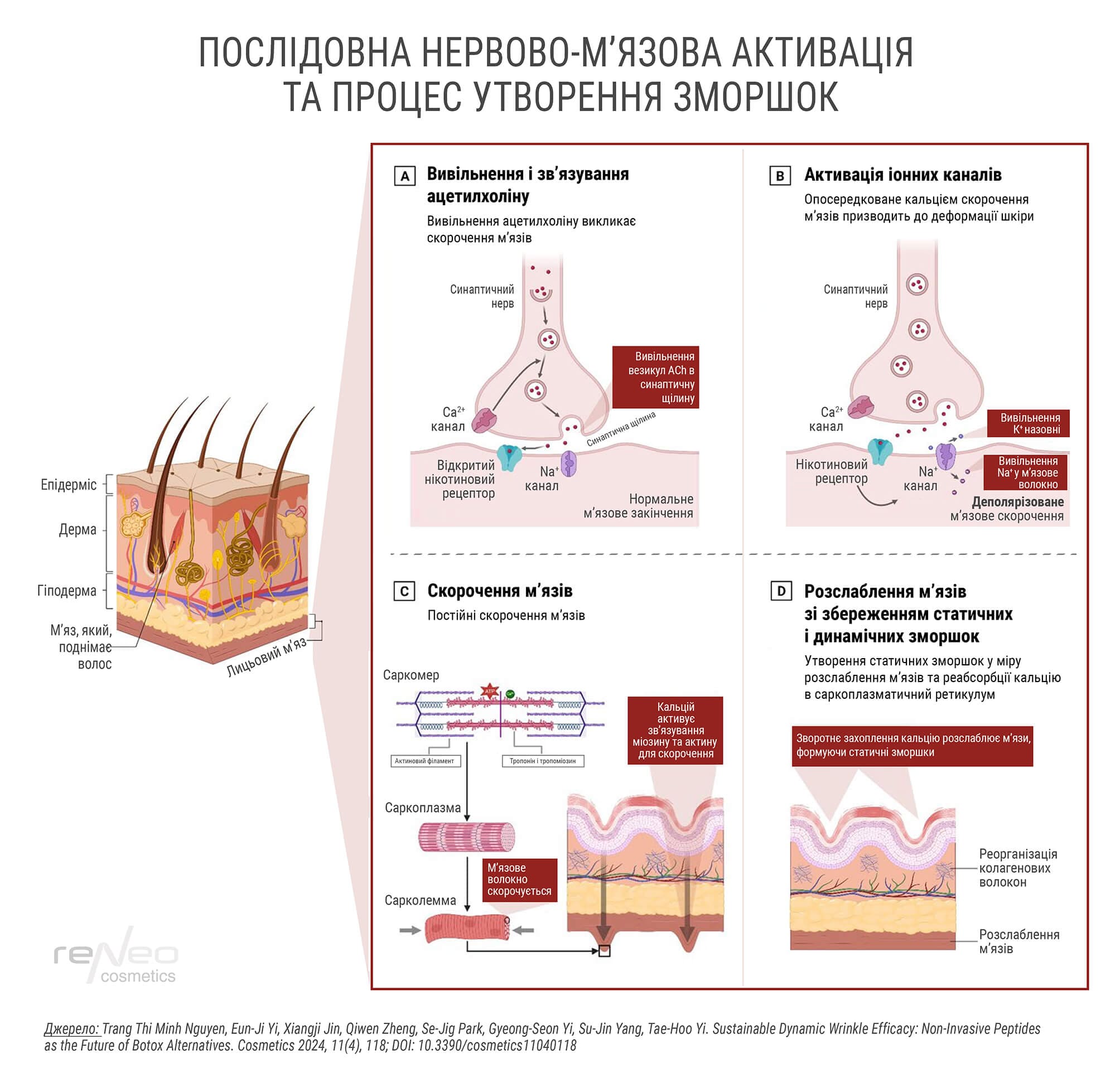 Повторювані скорочення м’язів обличчя створюють механічну напругу на шкіру, провокуючи утворення динамічних зморшок. З віком зниження вироблення колагену та еластину послаблює здатність шкіри до відновлення, перетворюючи динамічні зморшки на статичні лінії. Крім того, цей процес прискорюється під впливом факторів навколишнього середовища, таких як ультрафіолетове випромінювання, що сприяє деградації структурних білків. Для уповільнення цих змін застосовують зниження м’язової активності за допомогою ботулотоксину та стимуляцію синтезу структурних білків для підтримки пружності шкіри.