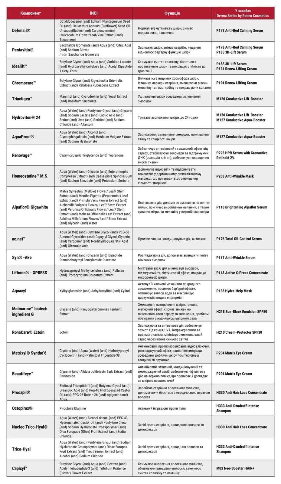 Співвідношення маркетингових назв та INCI-еквівалентів