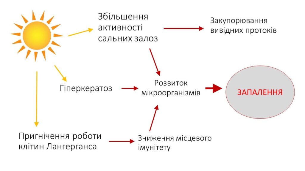 Крім того, УФ спричиняє виникнення гіперкератозу – потовщення рогового шару епідерміса. Припиняється доступ кисню до клітин, анаеробна мікрофлора активно розмножується, з’являються запальні елементи.