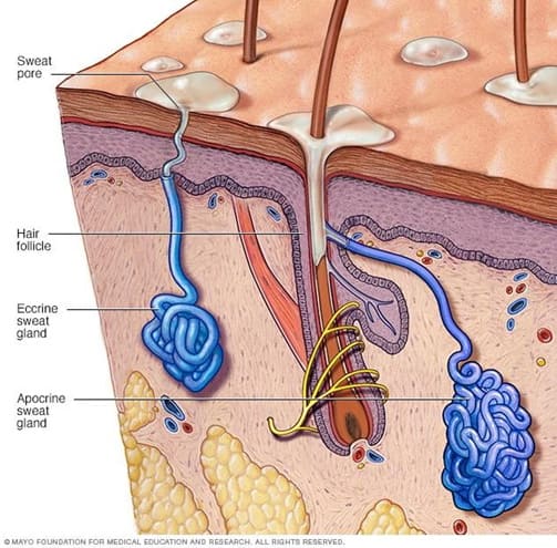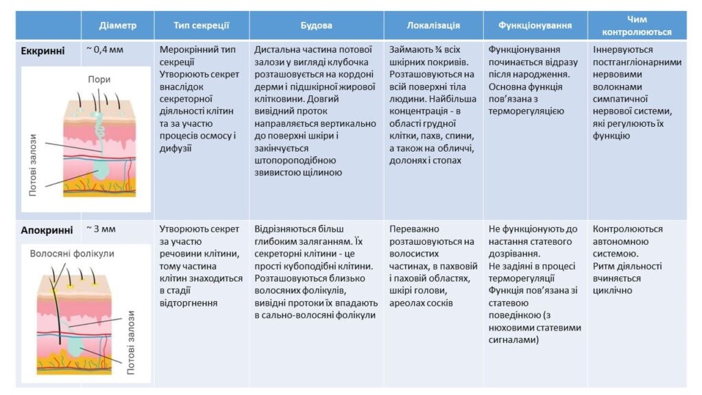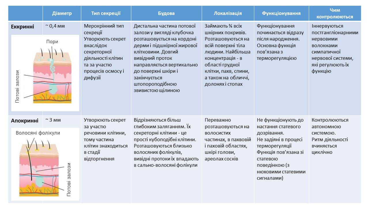 У людини є два типи потових залоз: еккринні і апокринні залози.
