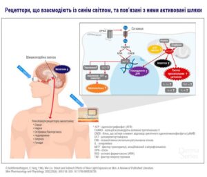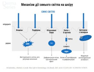 Синє світло чинить прямий вплив на шкіру, взаємодіючи з хромофорами: флавинами, порфірінами, опсинами, нітрозованими білками (наприклад, S-нітроальбумін). Активація цих молекул призводить до надвиробництва активних форм кисню (АФК), вивільненню активних форм азоту (оксиду азоту (NO)), гіперпігментації.