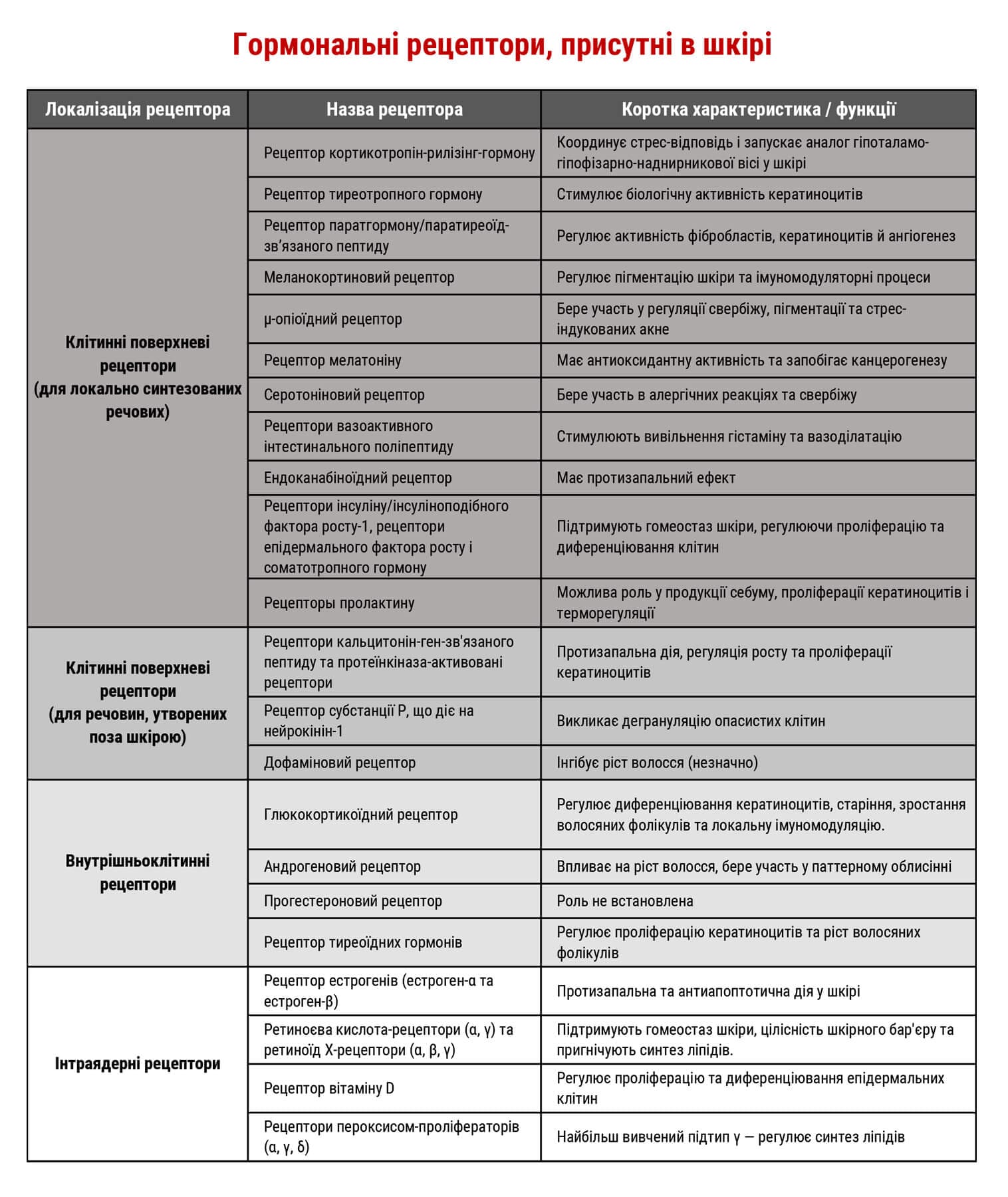 Шкіра – це ендокринний орган. Кожна клітина шкіри має рецептори – «вусики», які, в першу чергу, реагують на рівень гормонів у крові та тканинах. На поверхні клітин шкіри розташовані рецептори до пептидів та нейромедіаторів, а внутрішньоклітинні рецептори взаємодіють з тиреоїдними та стероїдними гормонами. Деякі з рецепторів на поверхні клітин реагують на речовини, що виробляються локально, тоді як інші містять ліганди, що переносяться кровотоком. Такі рецептори є на фібробластах, кератиноцитах, клітинах сальних залоз і меланоцитах.