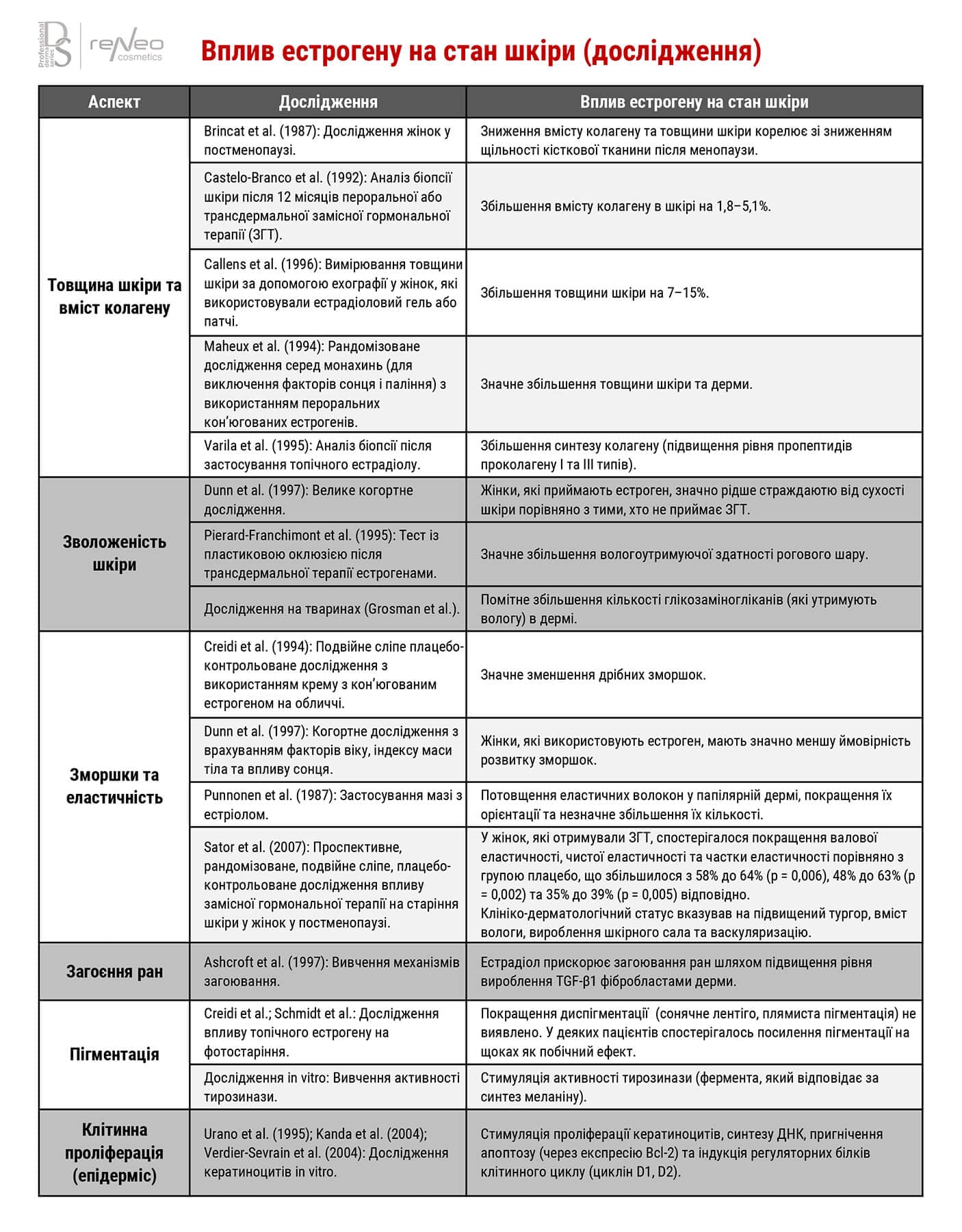 Клінічні дослідження показують: у жінок після менопаузи системна замісна гормональна терапія з естрогеном збільшувала товщину дерми і синтез колагену. Прийом орального естрогену протягом року може збільшити товщину дерми на ~30%, а за 6 місяців збільшити колаген (проколаген) на 6,49%. Також відзначено, що при прийомі естрогенів синтез глікозаміногліканів та гіалуронової кислоти у шкірі підвищується, що покращує зволоження та еластичність. У дослідження міждисциплінарного підходу в постменопаузі підкреcлено, що дефіцит естрогенів призводить до зниження васкуляризації шкіри та бар’єрної функції, що клінічно проявляється сухістю, зморшками та стоншенням шкіри.