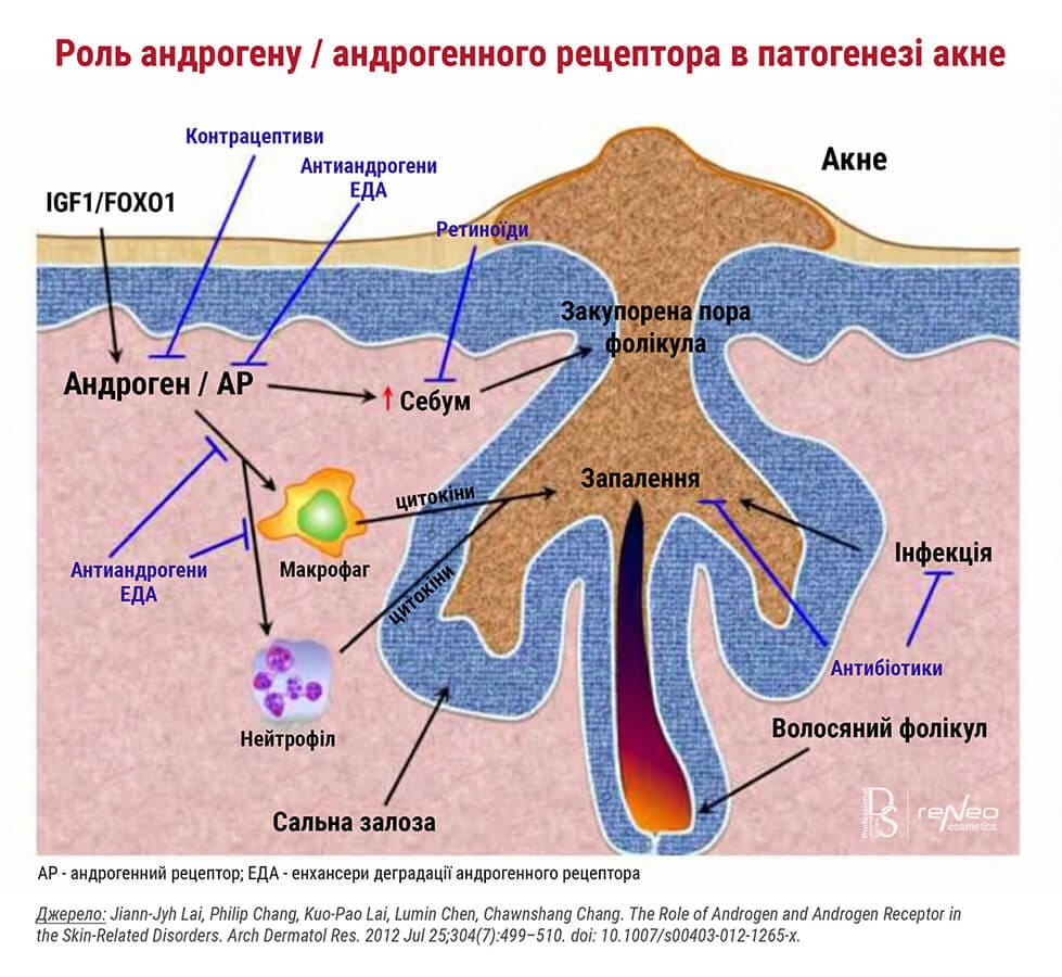Антиандрогени знижують рівень андрогенів, а енхансери деградації АР (ЕДА) безпосередньо впливають на AР, регулюючи AР-опосередковану активність під час формування/прогресування акне, таку як зменшення вироблення шкірного сала та пригнічення функції макрофагів і нейтрофілів для зменшення запальної реакції.