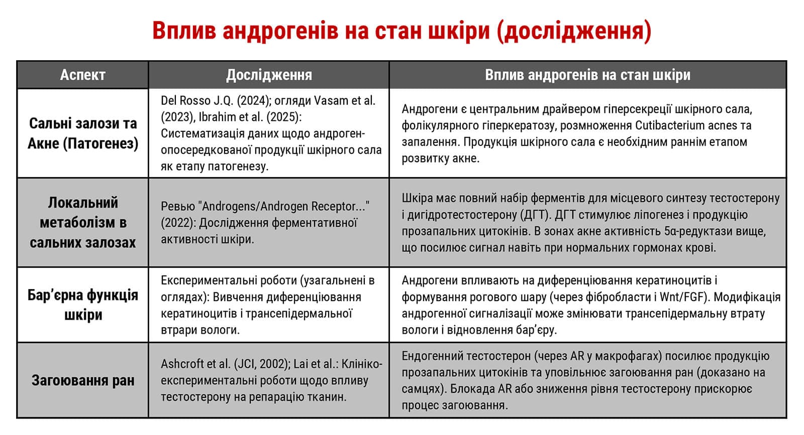 Основний андроген — тестостерон, а також його попередники — DHEA (дегідроепіандростерон) і андростендіон. Усі вони синтезуються з холестерину, в основному в наднирниках і статевих залозах. Але у шкірі ключовим є активна форма тестостерону – дигідротестостерон — DHT, яку місцево регулює фібробласт.