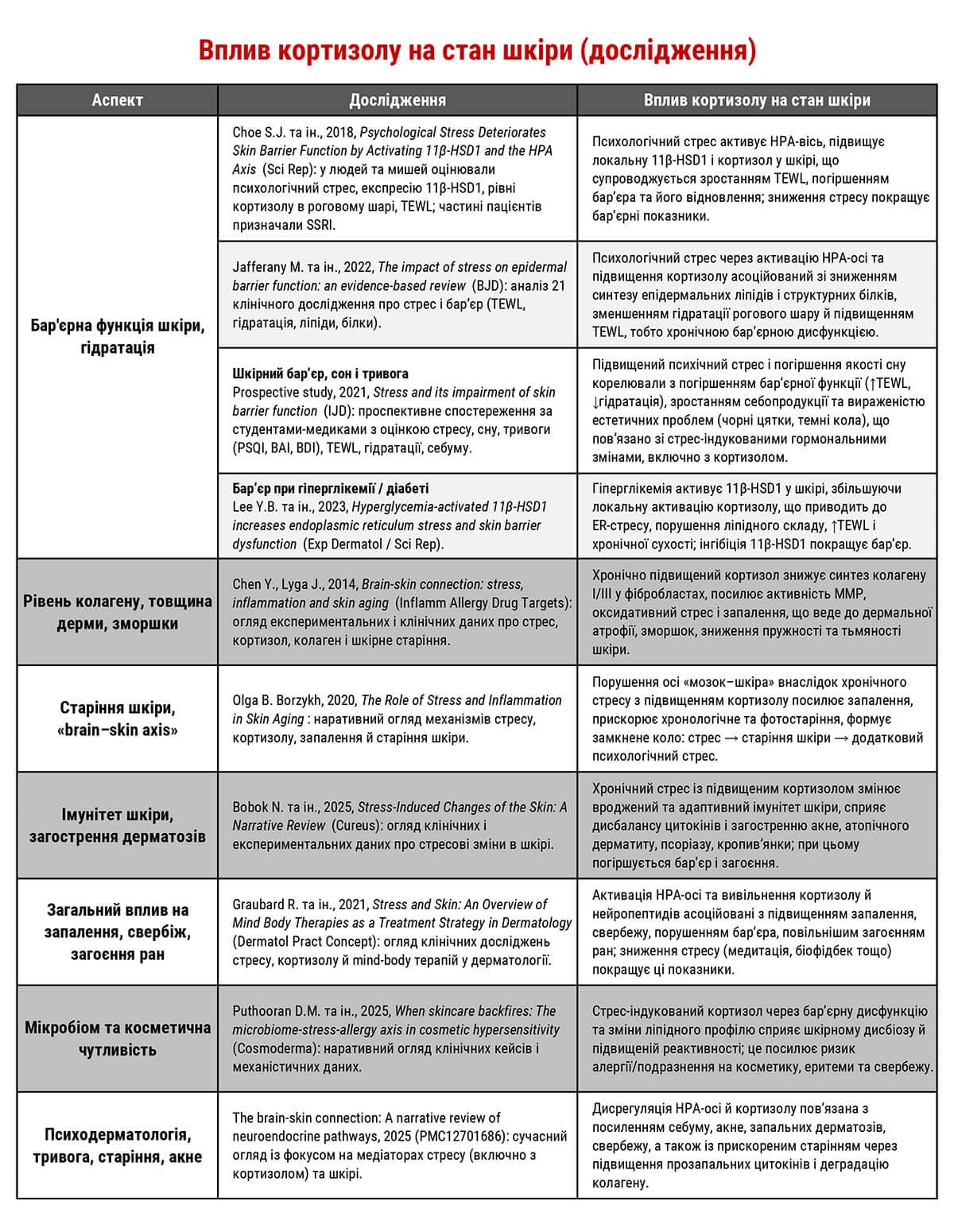 9. M. Maarouf, C.L. Maarouf, G. Yosipovitch, V.Y. Shi. The impact of stress on epidermal barrier function: an evidence-based review. British Journal of Dermatology. Volume 181, Issue 6, Dec 2019, p. 1129-1137. https://doi.org/10.1111/bjd.17605