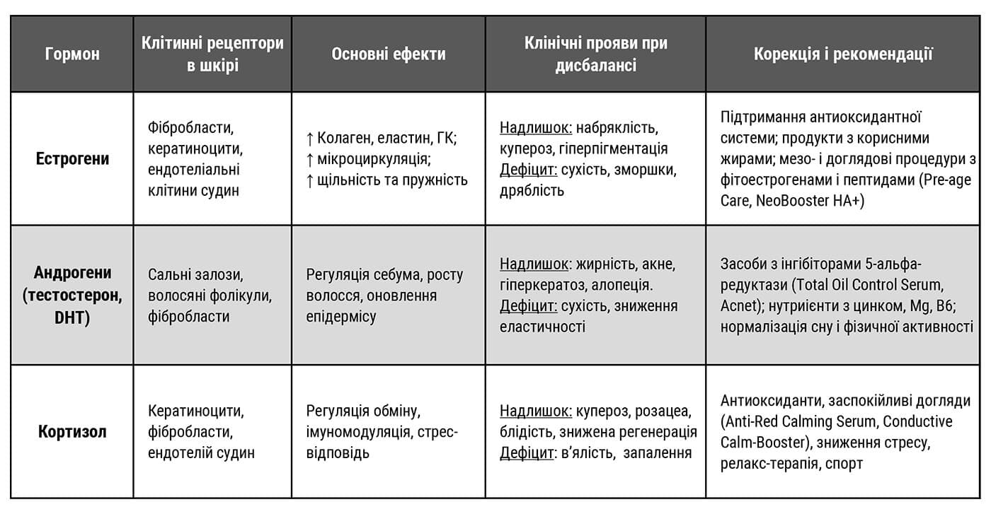 Баланс стероїдних гормонів є ключовим для здорової красивої шкіри. Дисбаланс стероїдних гормонів шкіри призводить до зміни роботи сальних залоз, зниження щільності та тонусу, порушення регенерації та бар’єрної функції. Шкіра стає або надмірно жирною та запаленою, або сухою, тонкою та чутливою. У таких випадках важливий не тільки косметичний вплив, але й відновлення загальної гормональної рівноваги організму. Обов’язково слід звернутися до лікарів ендокринологів для скринінгу гормонального фону, щоб унеможливити патології органів ендокринної системи.