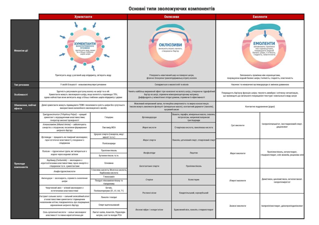 Сучасні зволожуючі засоби догляду за шкірою часто поєднують інгредієнти з різними механізмами дії, що дозволяє досягати оптимальних результатів у кожному конкретному випадку, з урахуванням клінічної картини пацієнта.