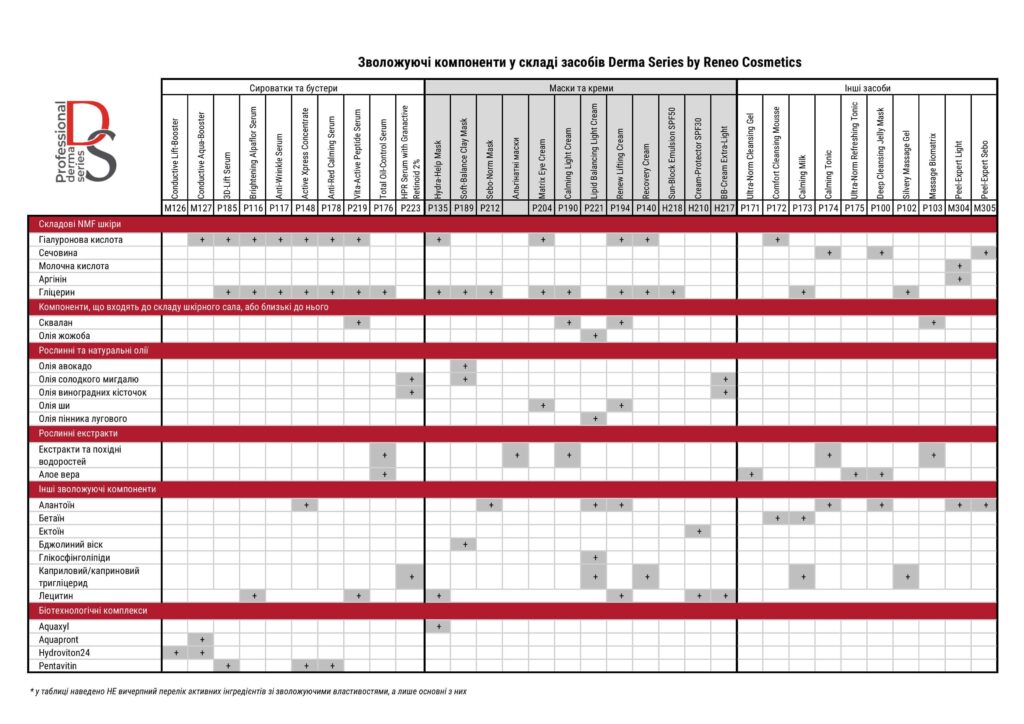 Таким чином, правильне зволоження необхідне будь-якій шкірі, незалежно від її типу та віку, у будь-яку пору року. Саме тому більшість сироваток, кремів, масок Derma Series by Reneo Cosmetics містять зволожувальні компоненти.